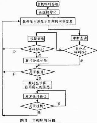 根據(jù)需要,設(shè)計(jì)出主機(jī)的呼叫工作流程圖(如圖5所示)。主機(jī)處在空閑狀態(tài)下,即沒有呼叫和通話時(shí),走廊上的數(shù)碼顯示屏?xí)@示實(shí)時(shí)的口期和時(shí)間等信息,同時(shí)主機(jī)會(huì)不斷進(jìn)行中斷查詢,判斷此時(shí)是否有分機(jī)發(fā)送的呼叫信號(hào),若沒有的話就執(zhí)行按鍵查詢,判斷是否撥號(hào)呼叫;當(dāng)主機(jī)與分機(jī)進(jìn)行通話時(shí),雙方接通后,此時(shí)數(shù)碼顯示屏?xí)@示病人的相關(guān)信息,如病房號(hào)、床位號(hào)等。