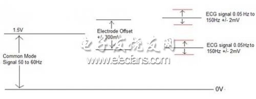 心電圖的前端必須能夠處理極弱信號范圍為0.5 mV至5.0 mV,結(jié)合直流分量高達±300 mV - 由電極 - 皮膚接觸產(chǎn)生 - 加上共模分量高達1.5 V,由電極和地之間的電位產(chǎn)生。