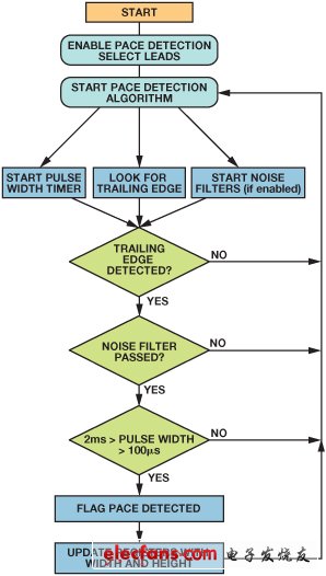 器件的前端包含一種數(shù)字起搏器偽像檢測(cè)算法,可以檢測(cè)到寬度范圍為100 μs至2 ms、幅度范圍為400 μV至1000 mV的起搏偽像——符合上述AAMI和IEC標(biāo)準(zhǔn)。根據(jù)測(cè)試結(jié)果和醫(yī)師意見,這些限制要比醫(yī)用標(biāo)準(zhǔn)寬松許多。