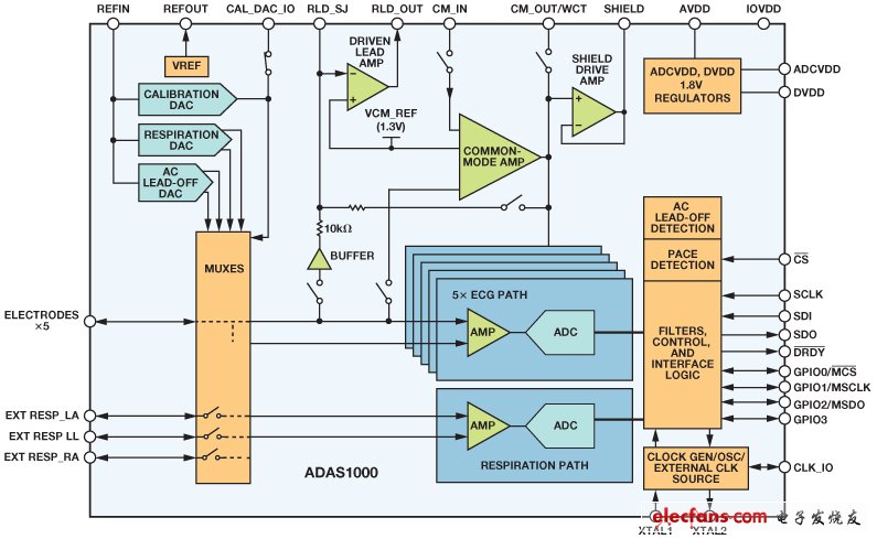 ADAS1000(圖8)是一款5通道心電圖(ECG)模擬前端(AFE),旨在幫助解決新一代低功耗、低噪聲、高性能系留式和便攜式ECG系統(tǒng)設(shè)計(jì)人員面對(duì)的部分挑戰(zhàn)。ADAS1000專門針對(duì)監(jiān)控級(jí)和診斷級(jí)心電圖測(cè)量而設(shè)計(jì),由5個(gè)電極輸入和1個(gè)專用右腿驅(qū)動(dòng)(RLD)輸出參考電極構(gòu)成。