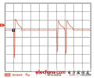 圖7所示為心臟再同步器件起搏模式在鹽水箱中的示波器軌跡。這是起搏器驗(yàn)證的標(biāo)準(zhǔn)測(cè)試環(huán)境;大家認(rèn)為,鹽水的導(dǎo)電性能與人體相似。由于示波器探頭十分接近起搏導(dǎo)聯(lián)線,結(jié)果導(dǎo)致幅度遠(yuǎn)遠(yuǎn)大于皮膚表面的預(yù)期值。另外,由于鹽溶液導(dǎo)致心電圖電極阻抗變低,結(jié)果使噪聲遠(yuǎn)遠(yuǎn)低于皮膚表面測(cè)量的正常值。