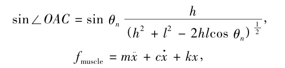 人體運動系統(tǒng)是由骨骼和固著在骨上的肌肉組成的,肌肉的收縮和舒張牽動骨骼,使人體能夠進行各種運動。 由于人體結構和功能的特殊性和復雜性,將人體下肢作適當簡化及必要的假設后,對人體下肢建立其功能模型,圖 4 為下肢的小腿部分骨-肌肉功能模型。 這里,骨骼簡化為棍狀結構體,肌肉簡化為由彈簧-阻尼組成的阻抗模型。 其中: k 和 c 分別表示彈性系數和阻尼系數,并忽略了由摩擦力和機械傳動阻力引起的未知干擾,模型的運動方程為: