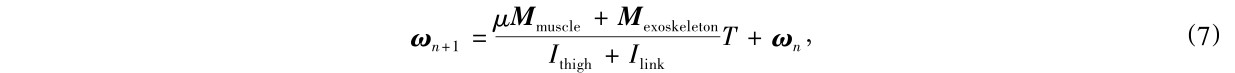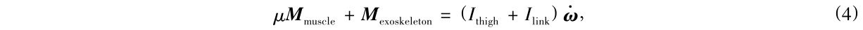 步行助力機器人與人體下肢通過束帶緊密聯(lián)系在一起,如圖 5 所示,步行助力機器人的最終運動是通過位于使用者與裝置間的各測力點感受到的人體運動時的多維力信息來完成自主運動,不需要任何操縱臺或外部控制設備,形成一個高度自動化的人-機混合系統(tǒng)。 助力機器人要達到助力的功能,首先,對使用者下肢運動預判;其次,助力裝置除克服自身動力矩(主要由裝置自身重量引起的重力矩)外,還要降低人體肌肉對關節(jié)所能產生的力作用,即降低肌力,從而達到助力的目的。 結合裝置自身的動力矩,對式(3)進行如下調整: