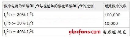 每次脈沖沖擊保險(xiǎn)絲,保險(xiǎn)絲都會(huì)受到一定的損傷,經(jīng)過多次反復(fù)沖擊保險(xiǎn)絲就會(huì)熔斷。以下為AEM產(chǎn)品耐受沖擊次數(shù)的表格: