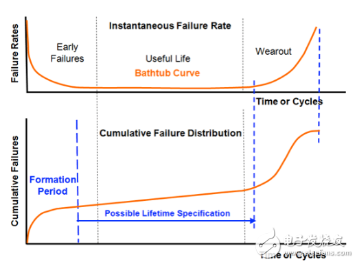如圖1所示,鋰離子電池在生產(chǎn)過(guò)程中采用陳化等機(jī)制,會(huì)將部分缺陷產(chǎn)品提前暴露出來(lái),使得投入市場(chǎng)的產(chǎn)品具有相對(duì)較低的瞬時(shí)失效率。然而隨著使用時(shí)間的延長(zhǎng)或者循環(huán)次數(shù)的增加,鋰離子電池由于化學(xué)反應(yīng)和應(yīng)力等因素,內(nèi)部材料開(kāi)始老化,直觀(guān)的表現(xiàn)為容量衰減、體積增大膨漲及內(nèi)阻增高。