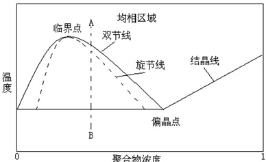 [8]和潘波[10]等對熱致相分離法制膜的原理和過程進行了評述。典型的弱相互作用的結(jié)晶性聚合物-溶劑體系相圖如圖2所示[11]。溫度在雙節(jié)線和結(jié)晶線以上時體系為均相溶液。圖中AB線列出了一個成膜的過程。A點是起始點,體系此時是均相溶液,然后降溫向B點移動。當溫度到達雙節(jié)線時,溶液開始分相為連續(xù)的聚合物富相和稀釋劑富相,并且兩相尺寸逐漸長大,直到溫度低于結(jié)晶溫度后,聚合物固化定型。當體系A點位于臨界點左邊時分相情況稍有不同,即稀釋劑富相為連續(xù)相,但是這種情況下體系固化后無法成膜。當體系A點位于偏晶點右邊時,體系將發(fā)生液固分相,聚合物直接從體系中結(jié)晶析出。