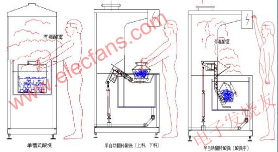 現(xiàn)今一般企業(yè)都采用二槽式手動酸洗產(chǎn)品:即酸槽、水槽另加沖水槽。此設(shè)備適用于普通大塊硅料清洗,對小顆粒和碎片硅料清洗有一定難度。再者對操作人員要求相對較高,酸霧和酸液對操作人員的危害系數(shù)增多??紤]安全生產(chǎn)和為了保證產(chǎn)品清潔度,在此設(shè)備上做了三項工藝改進: