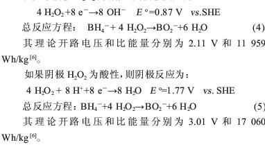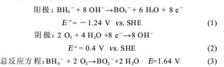 通過理論計算可以得出硼氫化鈉燃料電池的開路電壓和?比能量分別為1.64?V和9?295?Wh/kg比甲醇的開路電壓和比?能量分別高0.4?V和 3?200?Wh/kg[6]。