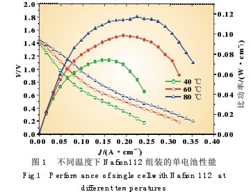2.1溫度對直接硼氫化鈉燃料電池性能的影響?圖1是利用自制的電極和Nafion112膜組裝的電池在不?同溫度下的工作性能曲線。其陽極NaBH4和陰極H2O2的濃?度均為10%,電池的陽極陰極流速分別為0.8?mL/min,3.2?mL/min。從圖中可以看出,隨著溫度的升高,電池的最大比功?率有較大的提高,開路電壓也同時有所提高。在40℃時電池?的開路電壓為1.39?V,最大比功率為74?mW/cm2;當溫度升高?至60℃,開路電壓和最大比功率分別升高至1.42?V和99?mW/cm2;繼續(xù)升溫到80℃會使電池開路電壓比40℃時提高?了60?mV,最大比功率可達 117?mW/cm2。