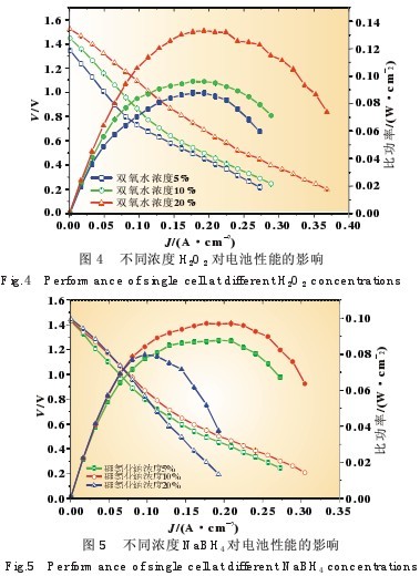 陽極硼氫化鈉溶液采用NaBH4含量為10%,其中含有?5%NaOH,5%NH·3H2O;陰極雙氧水采用H2O2含量為10%,其?中含有 5%H3PO4。對于不同濃度的NaBH4和H2O2其中各組?分的比例與上面的配比一致。