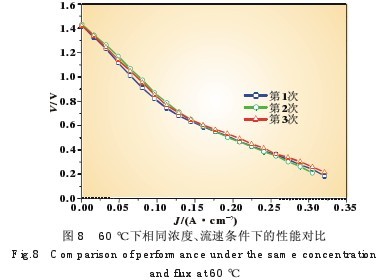 圖8為利用Nafion112制作的電池在60℃下相同濃度?(陽極NaBH4:10%,陰極H2O2:10%)、流速(陽極 NaBH4:?0.8?mL/min,陰極H2O2:3.2?mL/min)下幾次不同實驗的對比,
