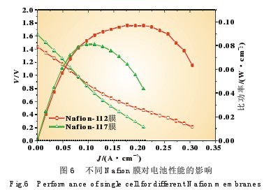 圖6是在相同的工作條件下(60℃;陽極NaBH4濃度為?10%,流速0.8?mL/min;陰極H2O2濃度為10%,流速3.2?mL/min)分別用Nafion112(厚度50μm)和Nafion117(厚度?175μm)制作的電池性能比較。從圖中可以看出,隨著Nafion膜厚度的增加,電池的開路電壓升高,這主要是由于低電流密?度下NaBH4滲透對電池性能起主要作用,隨著膜厚度的增加?NaBH4滲透逐漸減少,陰極極化減少,從而使陰極電極電位升?高,導致電池開路電壓升高。然而隨著放電電流密度的增加,?NaBH4滲透產(chǎn)生的陰極極化不再起主要作用,而Nafion膜本?身的膜電導成為控制電池性能的主要因素,Nafion膜越薄則?膜電阻也越小,從而電池性能越好。
