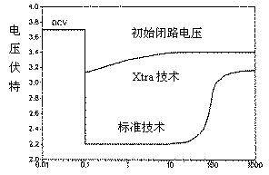 圖 3.1.1-1 瞬時電壓曲線 – 標準技術(shù)電池 ????然而,一旦電池開始放電,鈍化膜的厚度就逐漸減少,電阻回到一個穩(wěn)定的值,電池也達到了它的臺階電壓.