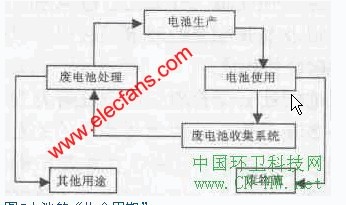 從“使用周期”的角度看,電池的生產、使用到廢棄也是一個商品的生命周期見圖2。因此,選料、制造、運輸、銷售、使用、回收利用、最終處置等環(huán)節(jié);都必須加強環(huán)境管理,企業(yè)在制定生產計劃、開發(fā)新產品和回收廢棄產品時必須考慮環(huán)境保護的要求;消費者在購買、使用和丟棄電池時也不能對環(huán)境造成危害,而發(fā)達國家在這方面做得比較完善。