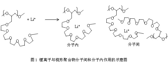 [12, 18]通過對(duì)梳形聚合物Poly(epoxide ether)-LiTFSI體系研究認(rèn)為,鋰離子與氧化乙烯的相互作用既可以發(fā)生在分子內(nèi),也可以是分子間,如圖1所示。分子間相互作用體系相對(duì)疏松,有利于離子快速傳輸。但是分子間相互作用的發(fā)生卻會(huì)使Tg迅速增大。而分子內(nèi)相互作用雖不會(huì)使Tg迅速增大,但形成的結(jié)構(gòu)緊密,離子傳輸困難。因此它們之間的平衡對(duì)獲得高的電導(dǎo)率是非常重要的。