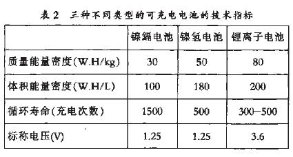 廣泛用于植入式醫(yī)療電子設(shè)備中的充電電池有鎳鎘電池、鎳氫電池和鋰離子充電電池(二次鋰電池)。三種電池的部分性能指標(biāo)參見表2。