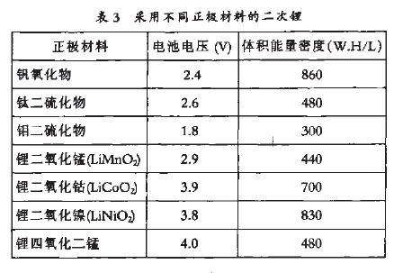 二次鋰電池是一類以金屬鋰為負(fù)極(陽極),以適合于鋰離子遷移的鋰鹽溶液為電解質(zhì),以具有通道結(jié)構(gòu),鋰離子可以方便地嵌人、脫出,但嵌人、脫出過程中結(jié)構(gòu)變化小的材料為正極(陰極)的新型電池體系。目前.用作鋰二次電池的正極材料有鋰鈷氧化物,鋰鎳氧化物,鋰釩氧化物,鋰鐵氧化物,鋰錳氧化物等,不同的正級(jí)材料組成的二次鋰電池的體積能量密度不同,參見表3所示。
