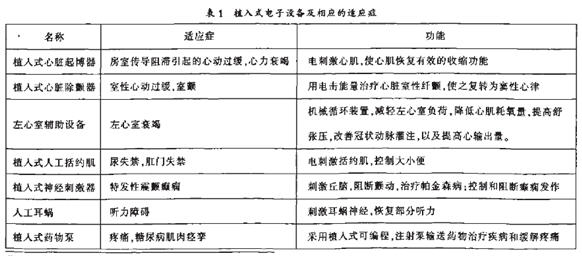植入式醫(yī)療設(shè)備可分為被動(dòng)式和主動(dòng)式兩種。大多數(shù)被動(dòng)式的植入式醫(yī)療設(shè)備是非電子產(chǎn)品,如隱形眼鏡、心臟支架、人造瓣膜、人造關(guān)節(jié)等組織結(jié)構(gòu)裝置。主動(dòng)式的植人式設(shè)備如植入式心臟除頗器和心臟起搏器等各種激勵(lì)系統(tǒng),需要能量供給才能代替或提高某個(gè)器官的功能,或者治療某種疾病。目前,植入式心臟除頗器和心臟起搏器這類裝置維持著上百萬心臟病患者的生命。其它激勵(lì)系統(tǒng)也被用于治療各式問題.如小便失禁以及慢性疼痛之類的疾病,深度腦激勵(lì)設(shè)備也用于治療諸如癲痛癥、痙攣性震頗和帕金森綜合癥等疾病。雖然這些產(chǎn)品目前的應(yīng)用規(guī)模不算大,但肯定會(huì)在不久的將來獲得更廣泛的運(yùn)用。表1列舉了部分植入式電子設(shè)備的功能以及它們的適應(yīng)癥。