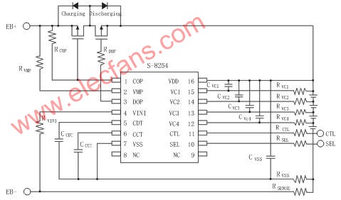 圖1是以精工S-8254A為保護IC的4串應用原理圖。S-8254 系列內置高精度電壓檢測電路和延遲電路,是用于3節(jié)或4節(jié)串聯(lián)鋰離子或者鋰聚合物可充電電池保護的IC。通過SEL端子的切換,可用來保護3節(jié)或4節(jié)串聯(lián)電池。