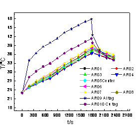 其中,熱成像結(jié)果顯示的顏色不同顯示溫度的變化情況。對(duì)試驗(yàn)過程中電池的表面溫度取圖中所示的10個(gè)區(qū)域,分別用AR1、AR2、AR3、AR4、AR5、AR6、AR7、AR8、AR9、AR10標(biāo)記。