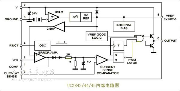 UC3842為雙列8腳單端輸出的它激式開關(guān)電源驅(qū)動集成電路,其內(nèi)部功能包括:基準(zhǔn)電壓穩(wěn)壓器、誤差放大器、脈沖寬度比較器、鎖存器、振蕩器、脈寬調(diào)制器(PWM)、脈沖輸出驅(qū)動級等等。UC3842的同類產(chǎn)品較多,其中可互換的有 MC3842、IR3842N、SG3842、CM3842(國產(chǎn))、LM3842等。UC3842內(nèi)部方框圖見圖。其特點(diǎn)如下: