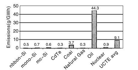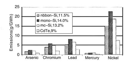 ?他們還研究了硅太陽能電池和碲化鎘太陽能電池生產(chǎn)與使用中其他重金屬的排放。研究結(jié)果表明(見圖2),碲化鎘太陽能電池的砷、鉻、鉛、汞、鎳等其他重金屬的排放量也比硅太陽能電池的低。該研究報告結(jié)論基于對美國First Solar公司碲化鎘薄膜太陽能電池生產(chǎn)線、碲化鎘太陽能電池組件使用現(xiàn)場的系統(tǒng)考察,和對其他太陽能電池、能源的實際生產(chǎn)企業(yè)的工藝、相關(guān)產(chǎn)品的使用環(huán)境研究分析得出。研究結(jié)果的科學性、公正性得到國內(nèi)外的認可。研究者在2006年歐洲材料年會硫系半導體光伏材料分會作的報告引起了與會人員的強烈關(guān)注。