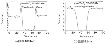 刻痕形貌對串聯(lián)集成的電子學特性有極大影響。激光入射方向、激光模式、刻劃速度和Q開關(guān)調(diào)制頻率是決定刻痕形貌的主要參量。從玻璃面入射比從薄膜面入射更容易得到高質(zhì)量的刻痕。圖5是分別用1064nm激光和532nm的激光刻劃CdS/CdTe薄膜后,用探針式表面輪廓分析儀測量的刻痕形貌。1064nm激光刻劃的刻槽邊緣有高達4微米的“脊狀峰”,這不利于后續(xù)沉積的背電極接觸層及金屬背電極與透明導電薄膜之間形成連續(xù)的具有良好歐姆特性的連接。