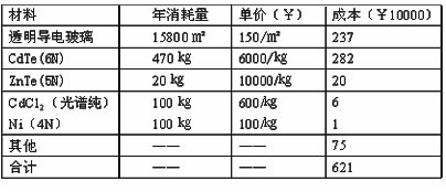 ????? 考慮電池的結(jié)構(gòu)為玻璃/SnO2:F/CdS/CdTe/ZnTe/ZnTe:Cu/Ni,碲化鎘薄膜的厚度為5微米,轉(zhuǎn)換效率為7%,1MW碲化鎘薄膜太陽能電池所消耗的材料的成本如下表所示。