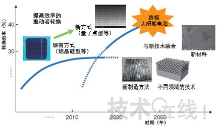 圖1:終極太陽能電池的實(shí)現(xiàn)過程現(xiàn)在主流的結(jié)晶硅型太陽能電池已經(jīng)逼近理論轉(zhuǎn)換效率。圖中左起依次為《日經(jīng)微器件》攝影和日本產(chǎn)業(yè)技術(shù)綜合研究所、美國NanoGram、京都大學(xué)、富士電機(jī)控股的數(shù)據(jù)。