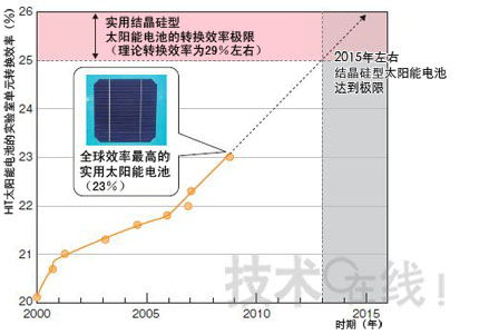 結(jié)晶硅型太陽能電池轉(zhuǎn)換效率提升的極限最快會(huì)在2015年左右到來。作為在結(jié)晶硅型太陽能電池表里形成有非晶硅層的“HIT(Heterojunction with Intrinsic Thin layer)太陽能電池”的獨(dú)家生產(chǎn)商,三洋電機(jī)于2009年5月在研究中實(shí)現(xiàn)了23%的單元轉(zhuǎn)換效率。該公司表示,這是10cm見方實(shí)用尺寸太陽能電池的世界最高紀(jì)錄。按照普遍看法,結(jié)晶硅型太陽能電池的理論轉(zhuǎn)換效率約為29%,而實(shí)用的最高值為25~26%,由此可見,與最高值的距離只剩下了小小幾個(gè)百分點(diǎn)。