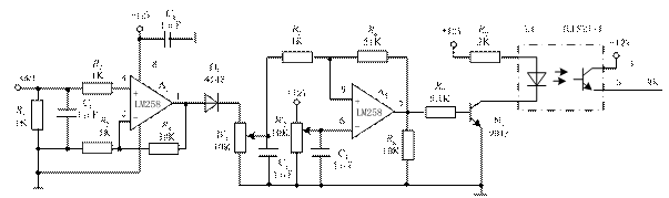 (4)考慮到光伏發(fā)電只有在太陽光強滿足一定強度的時候才能發(fā)電,啟動信號主要是利用光敏二極管檢測光強,保證系統(tǒng)在夜間或陰雨天不滿足發(fā)電條件的情況下,系統(tǒng)停止跟蹤,檢測電路如圖3所示。主要由放大、比較與光耦隔離3個部分組成;