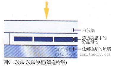 ????請參考圖 9 ,樹脂封裝系運用一鑄造程序:首先,黏著墊將該等太陽電池固定在兩片玻璃之間,然后,在兩側(cè)利用具有黏性的透明分隔物,將該等薄片在邊緣固定起來;上層系由一高透明硬化白玻璃所構(gòu)成;下層則由符合結(jié)構(gòu)上需求的傳統(tǒng)硬化玻璃所構(gòu)成;形成的空腔以高透明度的鑄造樹脂來填充,并使其硬化。