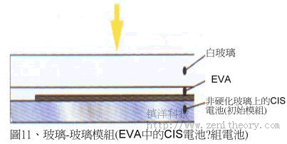 ??? 當(dāng)封裝銅銦硒 (CIS) 電池模塊和由金屬薄膜所制成的非晶硅薄膜電池模塊時,半導(dǎo)體薄膜系分別地涂布在基板玻璃和基板薄膜之上(圖 11 )。該銅銦硒 (CIS) 電池模塊前側(cè)另外有裝置一防止被陽光曝曬的玻璃,如果需要的話,可同時使用一 TSG 層。