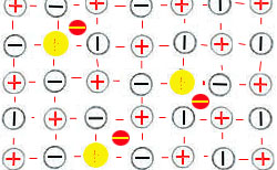??? 同樣,摻入磷原子以后,因為磷原子有五個電子,所以就會有一個電子變得非?;钴S,形成N(negative)型半導體。黃色的為磷原子核,紅色的為多余的電子。如下圖。