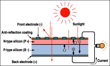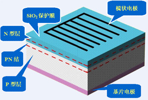 ??? 由于半導體不是電的良導體,電子在通過p-n結后如果在半導體中流動,電阻非常大,損耗也就非常大。但如果在上層全部涂上金屬,陽光就不能通過,電流就不能產生,因此一般用金屬網(wǎng)格覆蓋p-n結(如圖 梳狀電極),以增加入射光的面積。