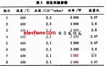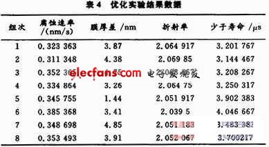 根據(jù)資料和實際經(jīng)驗,從以上幾組實驗中找出了一些實驗效果比較好的參數(shù),然后共得到8組優(yōu)化參數(shù),這8組實驗做完之后,再用1:5的氫氟酸對制得薄膜進行腐蝕,實驗具體參數(shù)如表3,實驗結(jié)果如表4。