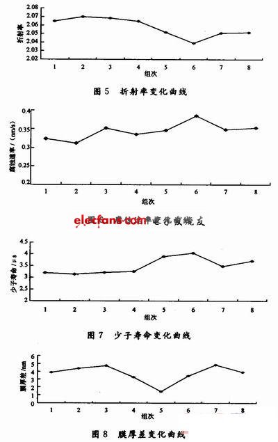 (4)溫度對薄膜的各個參數(shù)影響都不大。溫度上升,折射率增大(見圖5),腐蝕速度下降(見圖6)。