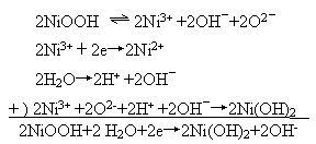 正極板上的活性物質(zhì)是氫氧化鎳(NiOOH)晶體。鎳為正三價離子(Ni3+),晶格中每兩個鎳離子可從外電路獲得負(fù)極轉(zhuǎn)移出的兩個電子,生成兩個二價離子2Ni2+。與此同時,溶液中每兩個水分子電離出的兩個氫離子進(jìn)入正極板,與晶格上的兩個氧負(fù)離子結(jié)合,生成兩個氫氧根離子,然后與晶格上原有的兩個氫氧根離子一起,與兩個二價鎳離子生成兩個氫氧化亞鎳晶體。