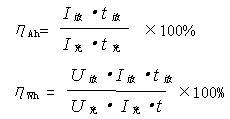 在正常使用的條件下,鎳鎘電池的容量效率ηAh為67%-75%,電能效率ηWh為55%~65%,循環(huán)壽命約為2000次。容量效率ηAh和電能效率ηWh計算公式如下: