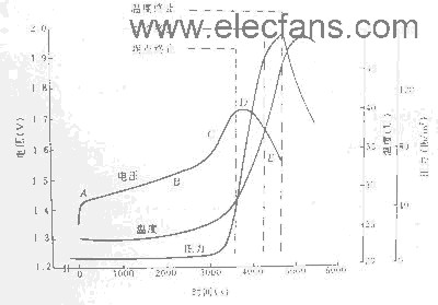 電解液中,氧氣的產(chǎn)生和復(fù)合是放熱反應(yīng),電池過充電時(E點),不停地產(chǎn)生氧氣,從而使電池內(nèi)的溫度和壓力升高。如果強制排出氣體,將引起電解液減少、電池容量下降并損傷電池。若氣體不能很快排出,電池將會爆炸。