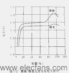 鎳氫電池的充電特性與鎳鎘電池類似,充電過程中二者的電壓、溫度曲線如圖1-2和圖1-3所示??梢钥闯?,充電終止時,鎳鎘電池電壓下降比鎳氫電池要大得多。當(dāng)電池容量達(dá)到額定容量的80%以前,鎳鎘電池的溫度緩慢上升,當(dāng)電池容量達(dá)到90%以后,鎳鎘電池的溫度才很快上升。當(dāng)電池基本充足電時,鎳鎘/鎳氫電池的溫度上升率基本相同。