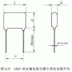 CH21 型金屬化復合膜介質(zhì)電容器采用金屬化復合膜卷繞而成,樹脂浸涂包封,單向引出,具有電容量穩(wěn)定、溫度系數(shù)小的特點,適用于精密儀器儀表、邏輯控制電路、積分電路等場合。其外形如圖4-57 所示,主要特性參數(shù)見表4-91 。