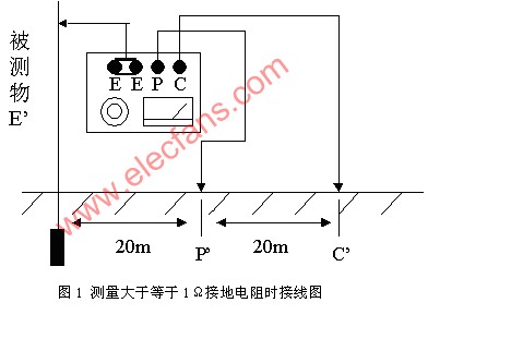 .2測量小于1Ω接地電阻時接線圖見圖2 將儀表上2個E端鈕導線分別連接到被測接地體上,以消除測量時連接導線電阻對測量結(jié)果引入的附加誤差。