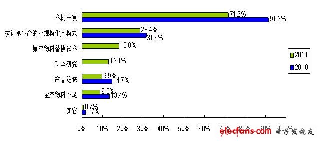樣機(jī)開發(fā)(71.6%)和小批量生產(chǎn)模式(28.4%)仍然是2011年小批量采購(gòu)的主要原因,但原有物料替換試樣(18%)和科學(xué)研究(13.1%)引起的小批量采購(gòu)表現(xiàn)較活躍,這兩項(xiàng)是2011調(diào)查新增的選項(xiàng)。此外,小批量采購(gòu)的原因還包括產(chǎn)品維修(9.9%)和量產(chǎn)物料不足(9%)。