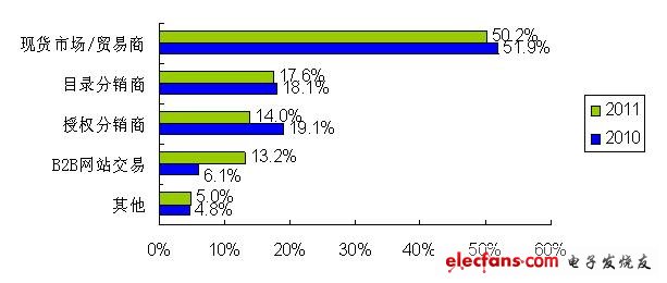 據(jù)2011報(bào)告數(shù)據(jù)顯示,沒有使用過(guò)目錄分銷商交易的比例從2010調(diào)查的40%下降到了2011調(diào)查的30.2%,顯示出工程師對(duì)目錄分銷商的認(rèn)知度正在增加。