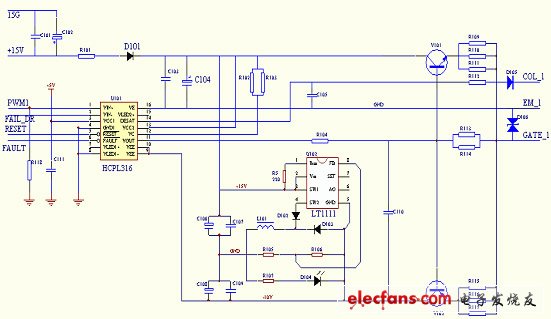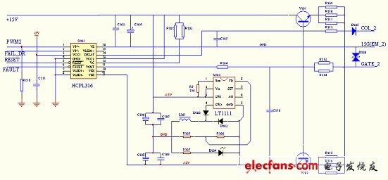 ????圖1為上管IGBT驅(qū)動電路,其中由控制器產(chǎn)生PWM1及RESET信號輸出給光耦,同時光耦產(chǎn)生的IGBT故障信號FAIL_DR給控制器;TL1111芯片把輸入的+15變換成-10V關(guān)斷電壓;同時利用二極管D101使的上管三路驅(qū)動+15V和其它路相互隔離;圖2為下管IGBT驅(qū)動電路,下管的驅(qū)動電源無須隔離,從而使得單電源供電成為可能,簡化了驅(qū)動電源的設(shè)計。對比上管驅(qū)動電路和下管驅(qū)動電路的區(qū)別,除了上管有二極管下管沒有以外,還有就是+15V的地接在下管的EM_2而上管沒有。可以看到,當(dāng)下管的IGBT導(dǎo)通時,+15V的地通過下管的IGBT和上管的EM1相通,此時電解電容C104處于充電狀態(tài),當(dāng)下管關(guān)斷時,通過C104放電來驅(qū)動上管IGBT導(dǎo)通。同時通過HCPL316故障檢測功能在IGBT過壓、過流及短路的情況下很好的保護IGBT。