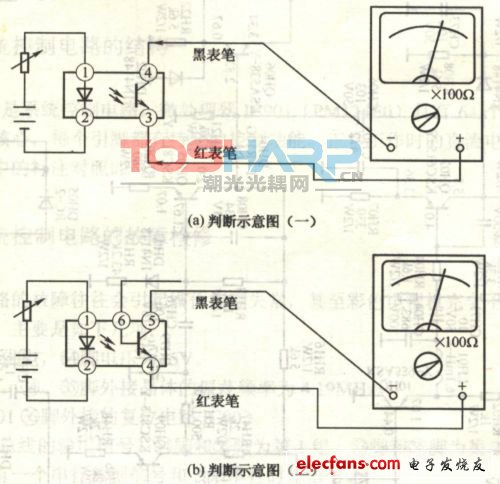 ?????? 光電耦合器的1、2腳之間的發(fā)光二極管具有單向?qū)蛐?,?a href="http://www.brongaenegriffin.com/v/tag/796/" target="_blank">萬用表的R×100Ω擋測量,正向電阻值應(yīng)為無窮大;當(dāng)1、2腳之間的發(fā)光二極管的電阻值變小時(shí),流過發(fā)光二極管的電流增大,3、4腳之間的電阻值變小,1、2腳之間與3、4腳之間的正常阻值應(yīng)為無窮大。