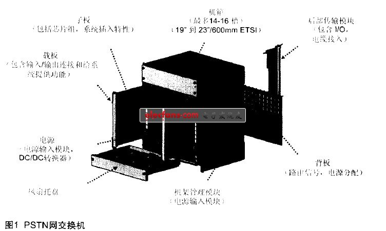 圖1所示為一個(gè)PSTN網(wǎng)的交換機(jī),該交換機(jī)由7個(gè)部分組成。除了機(jī)箱尺寸的區(qū)別,機(jī)箱底部是一個(gè)機(jī)架的管理模塊,它包括管理模塊、傳輸背板和傳輸模塊。最前面有子板、載板、電源板,以及風(fēng)冷系統(tǒng)、電扇托板。在交換機(jī)中,它的主要載板就是電話信息的傳輸以及輸入/輸出的連接,輸入,輸出系統(tǒng)所組成的只有很少的電腦板以及信令控制板。