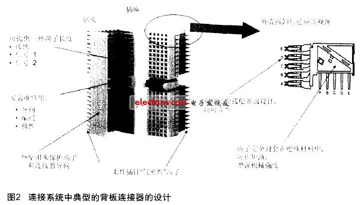 圖2是典型的連接系統(tǒng)中背板連接器的設(shè)計(jì)。它可以提供三種端子長(zhǎng)度,即接地端子、信號(hào)1端子、信號(hào)2端子三個(gè)端子的長(zhǎng)度是不同的。這是為了保證插座和插針在互相連接的時(shí)候,如果接反了,就無法插入。第二個(gè)是中問部分,它是用于安裝維修用的,整個(gè)插針板在插入的過程中,可以用來導(dǎo)向,甚至可以保證編碼和極性的正確。外壁用來保護(hù)端子和連接器的導(dǎo)向,這個(gè)端子就是插針部分,采用柔性插針。從右半部分圖中可以看到,外殼被拆除后,更清楚地顯示出了接觸面。它采用了雙柱冗余的接觸面設(shè)計(jì),這樣可以大大提高接觸的可靠性。