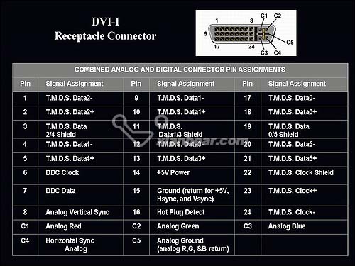 從針腳上可以看出,除了地線以外,DVI-I接口比DVI-D接口原架構規(guī)范上,多了RGBHV這幾個與 VGA 定義一樣的信號線插腳。而這些多余出來的針腳就是DVI-A,兩者結合就構成了DVI-I接口。